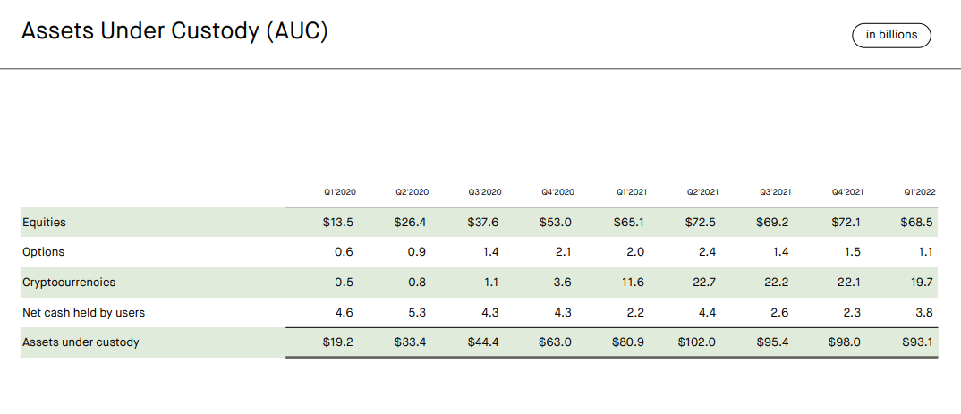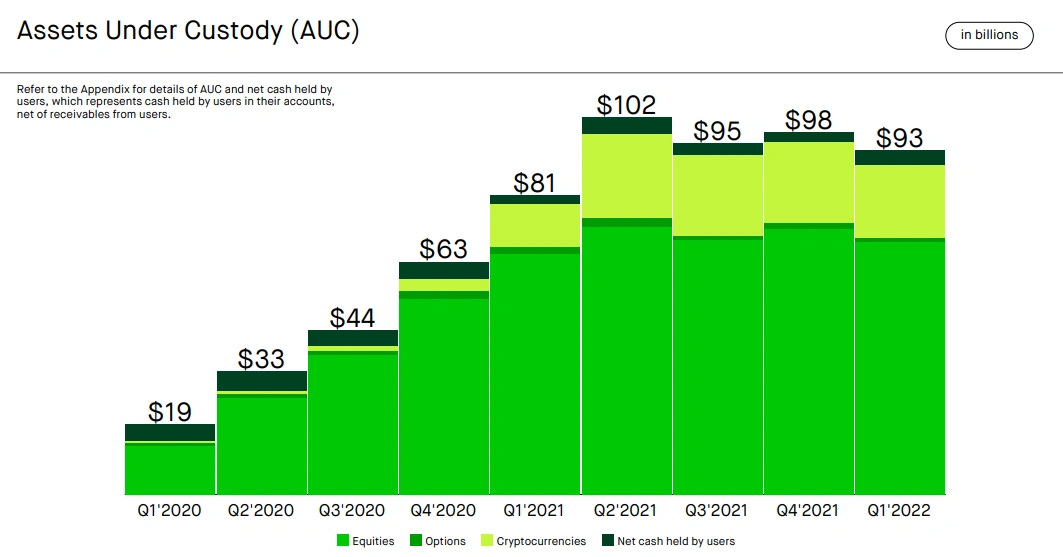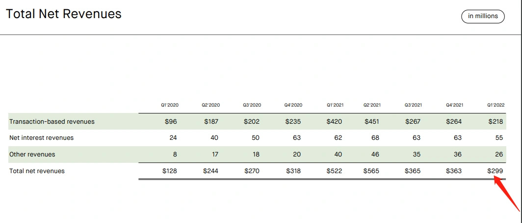 Robinhood Crypto 于 2018 年推出,直接与 Coinbase 等加密货币经纪公司竞争,罗宾汉优势在于其提供免佣金交易服务。在 21 年第一季度,950 万客户在平台上交易比特币、以太坊和狗狗币等加密货币——比上一季度增长 458%。22 年一季度末公司平台沉淀的加密资产规模来到接近 200 亿美元,而同期 Coinbase 平台沉淀加密资产规模为 2560 亿美元。Robinhood Crypto 相对较弱的地方在于它缺乏转账或取款功能:客户目前无法将他们的加密资产转入或转出他们的账户。