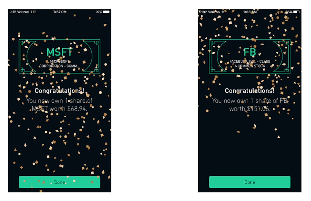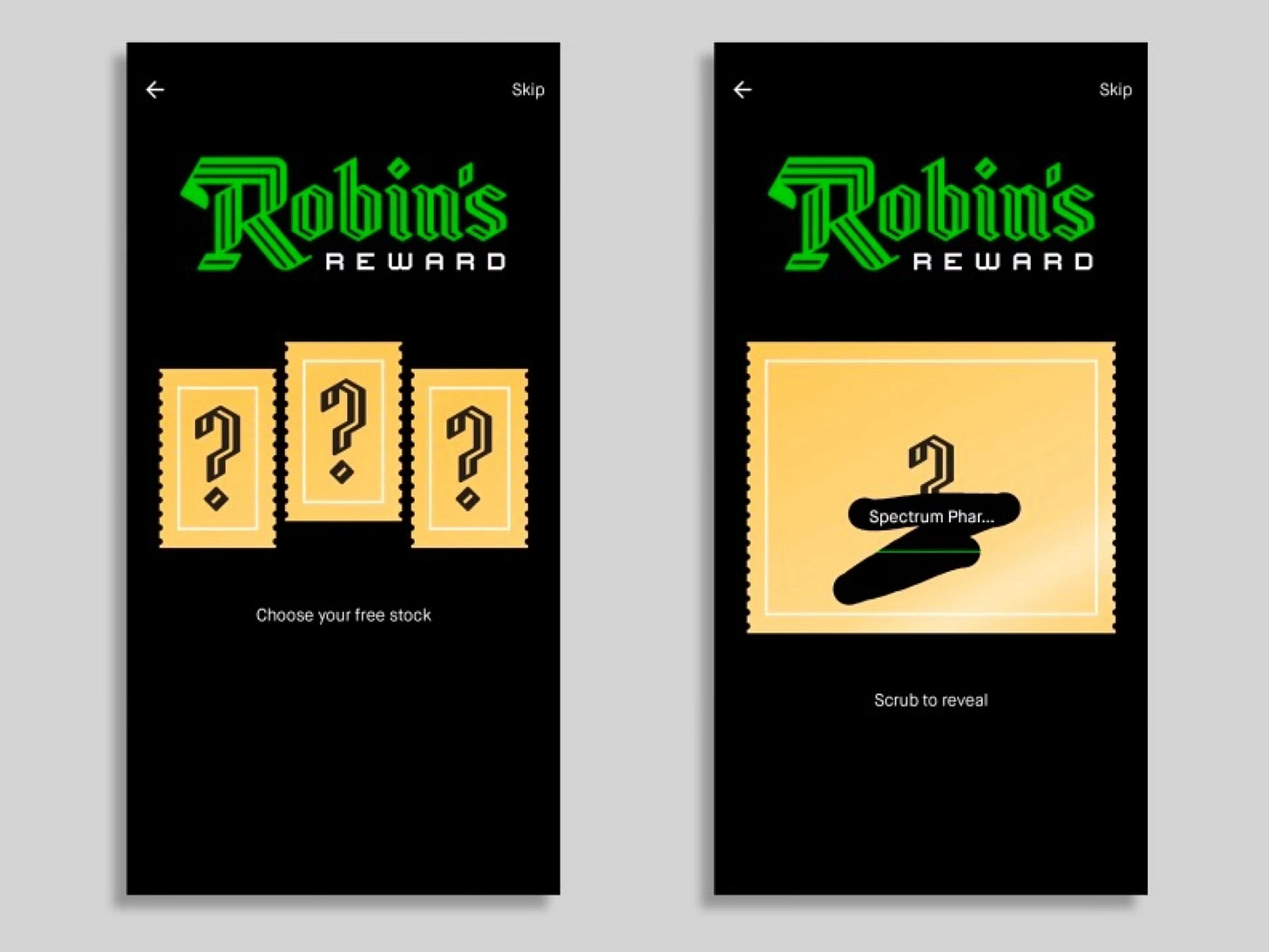 一旦客户开始与应用程序交互,游戏化元素就开始了。罗宾汉的承诺之一是新账户将获得免费股票——随机确定的公司的单一股票。虽然新用户理论上可以获得苹果或特斯拉等公司的股份,但实操中这不太可能。新用户有 98% 的机会获得价值在 2.50 美元到 10 美元之间的股票,以此来进行用户增长。
