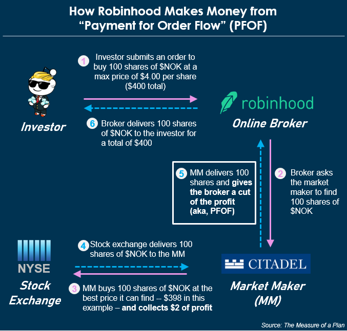 罗宾汉采取 PFOF (payment for order flow)来执行交易。PFOF 是一种有争议的做法,经纪商指示被称为“做市商”的第三方代表他们执行交易。对于罗宾汉,该过程如下所示: