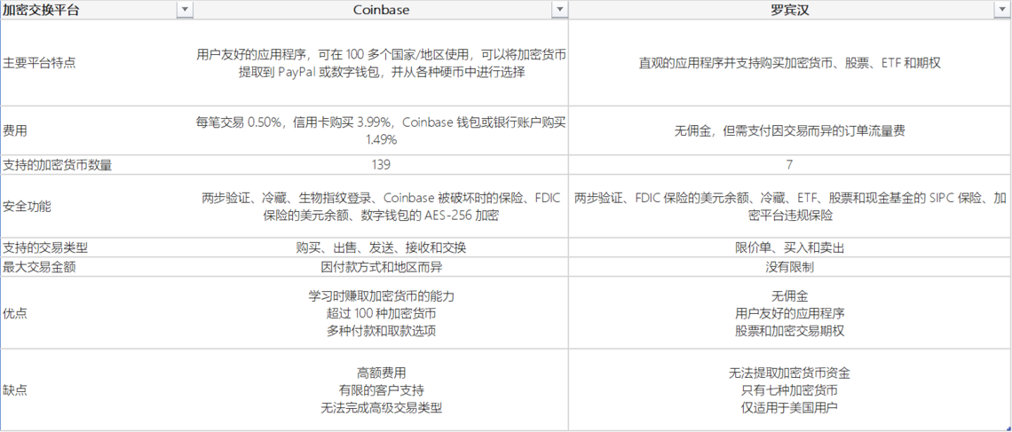 罗宾汉与 Coinbase 交易加密货币主要的优缺点对比如下: