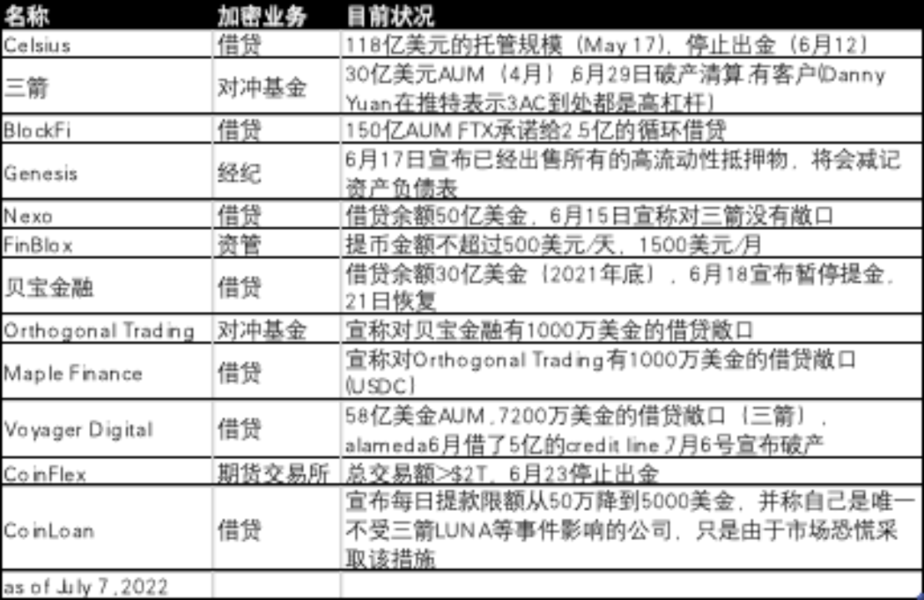 6 月 29 日,三箭资本宣布破产清算。三箭资本是目前全球加密借贷市场最大的贷方及客户之一,图中几乎所有机构都与三箭有业务往来(除了 NEXO 及 CoinLoan 已经宣称自己对三箭没有敞口)。三箭的破产清算会对市场造成连锁反应,大量机构将会被迫承担损失,对资产负债表进行减记,甚至直接申请破产。
