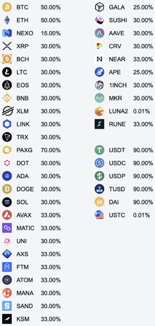 对于LTV的确定,目前(2022年7月4日星期一)NEXO及BlockFi网页上显示如下: