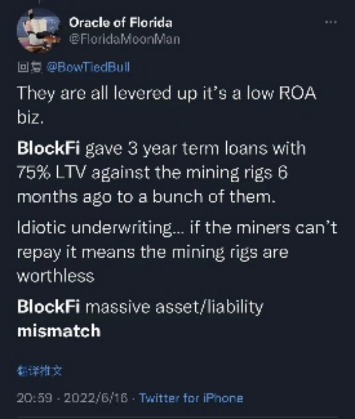 期限错配:期限错配是指资产池资金来源方的期限,与资金运用方(集合型资产包)的期限不完全相同。期限错配,尤其是资产端的长期化,叠加负债方的短期化,使得机构很容易发生踩踏,进而造成市场恐慌,平台只有宣布提币/出金冻结。下图显示市场传言 BlockFi 以非常高的 LTV 进行了长期(3 年期)借款行为。