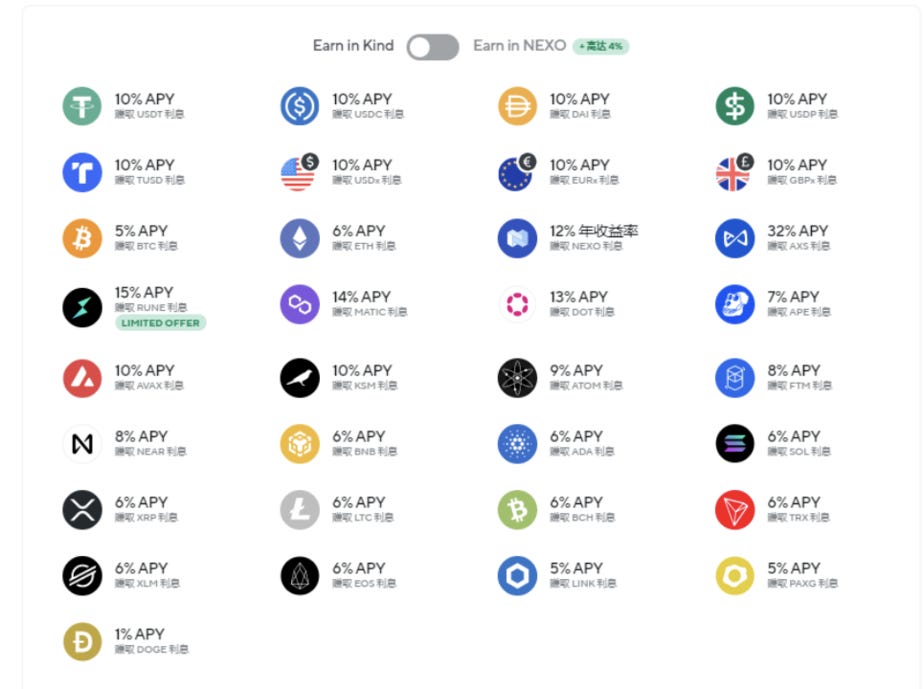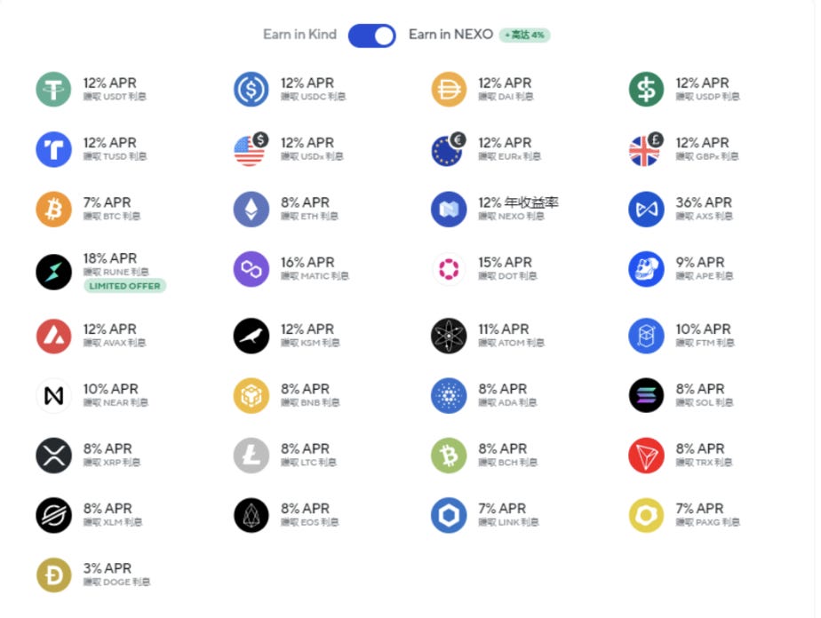 用户可以选择定期,也可以选择活期。定期存单可以在 LTV 不足时成为额外抵押品。利息可以以存款币种来发放(复利),也可以以平台代币来发放(单利),二者之间可以任意切换(以 NEXO 为例)。如果用户选择以平台代币作为利息收益,平台会提供额外的利息收益作为激励。用户可以随时存或者赎回产品。一般来说类似平台都会通过高收益率来吸引客户(如下图)。此图截取于 2022 年 7 月 4 日,虽然已经发生了众多平台的暴雷,NEXO 仍然将这种高收益噱头放在其官网上。