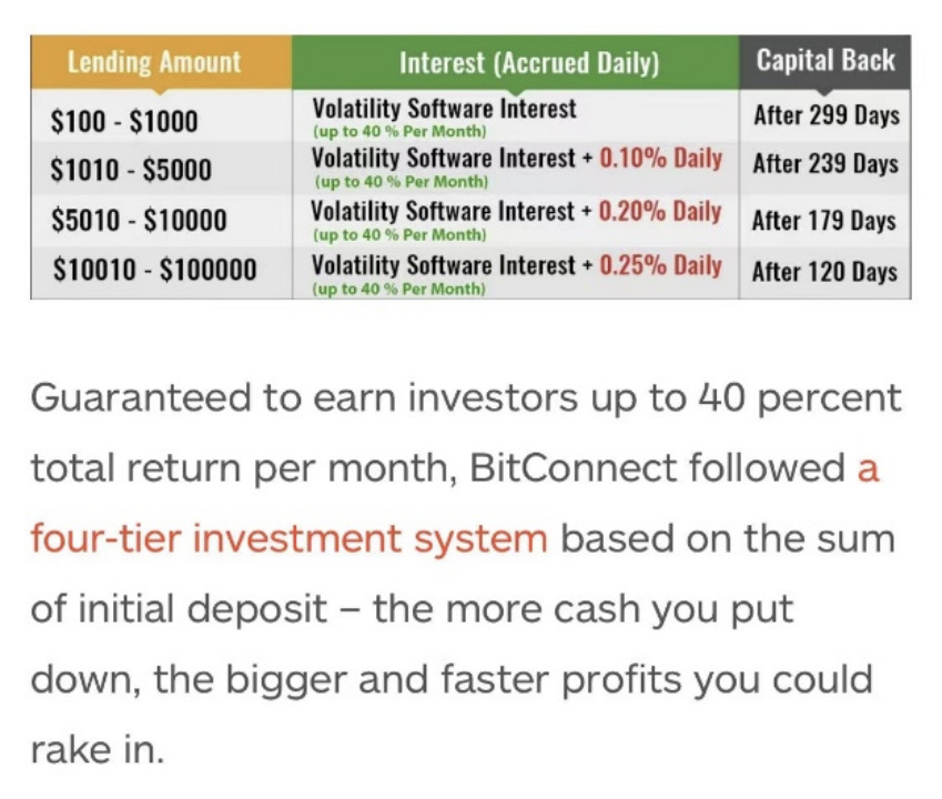 分离定价:分离定价是指同一资产池发售的各款理财产品收益水平,一般不与该款理财产品存继期内集合性资产包的实际收益直接挂钩,而是根据集合性资产包预期的到期收益率分离定价。这种定价方式会造成客户与 BlockFi 实际的风险与收益不匹配。下图是 Bitconnect 的一个例子,用户放的资金越多,“保证的”利率越高,回本周期越短,其利率与实际的底层资产收益不挂钩。